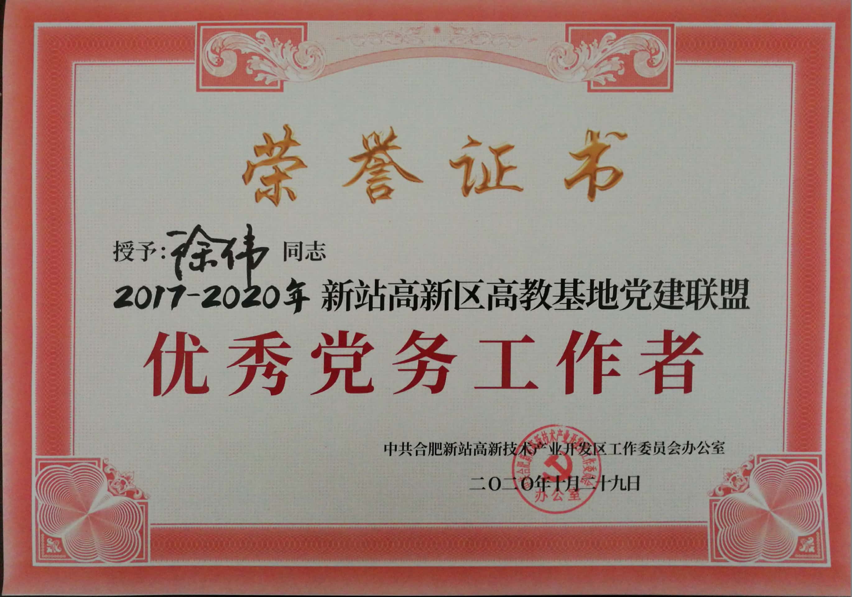 员工第一党支部徐伟喜获2017-2020年度新站高新区高教基地党建联盟“优秀党务工作者”荣誉称号。(昝洪岚/文图 吴成海/审核)