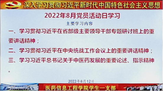 会议根据《关于8月份“三会一课”、党员活动日活动安排的意见》(信公司党函(2022)8号)的通知要求,学习贯彻习近平在省部级主要领导干部专题研讨班上的重要讲话精神、习近平在中央统战工作会议上的重要讲话精神和习近平总书记关于中医药发展的重要论述、指示精神。研讨交流假期参加社会实践活动的体会,部分党员同志分享了学习体会和研讨心得。(员工一支部 文/图 吴成海/审核)
