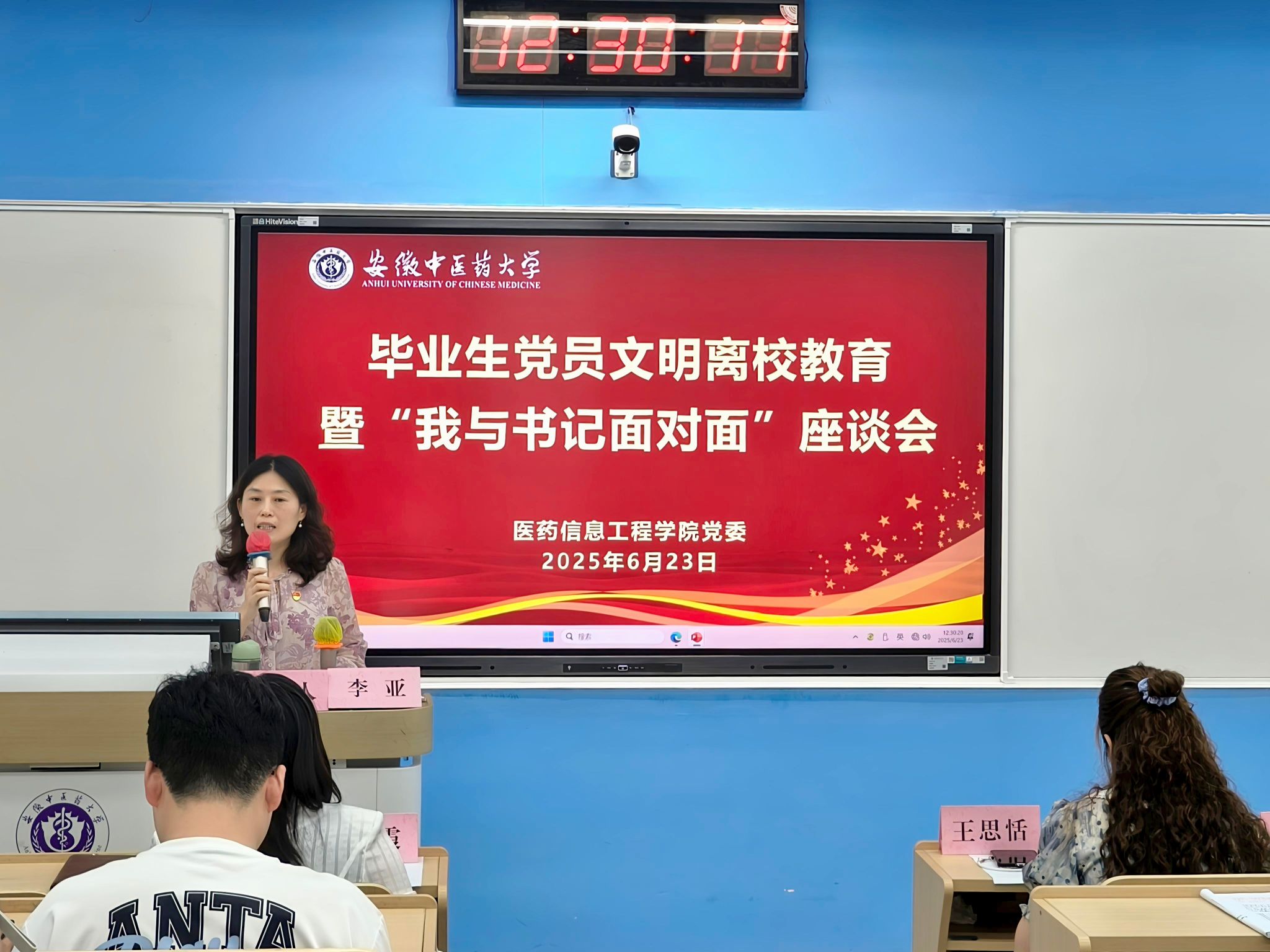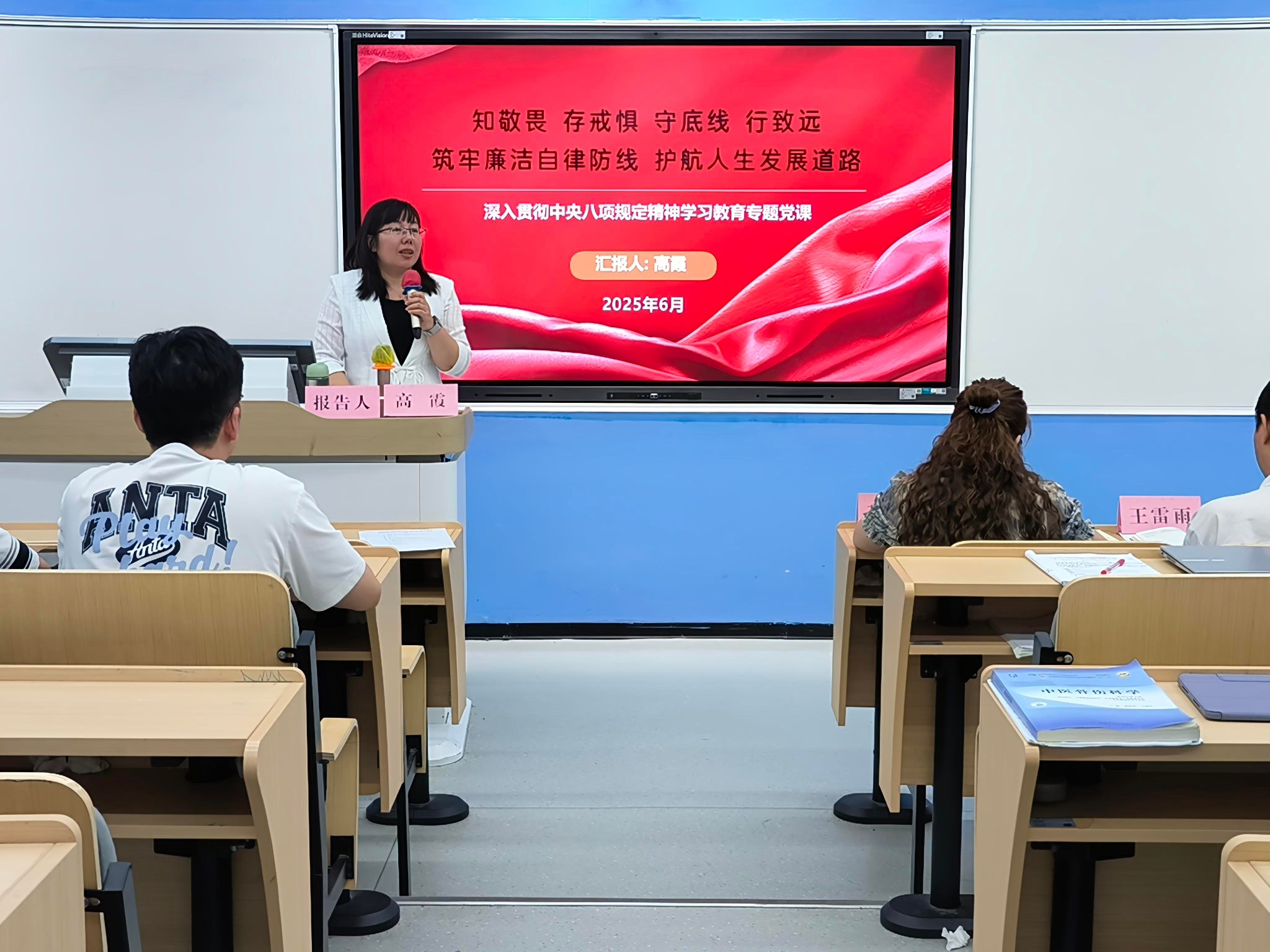 会上,高霞以《知敬畏 存戒惧 守底线 行致远 筑牢廉洁自律防线 护航人生发展道路》为题,通过党规党纪要求,联系典型案例,为2025届毕业生党员上了一堂廉政专题党课。