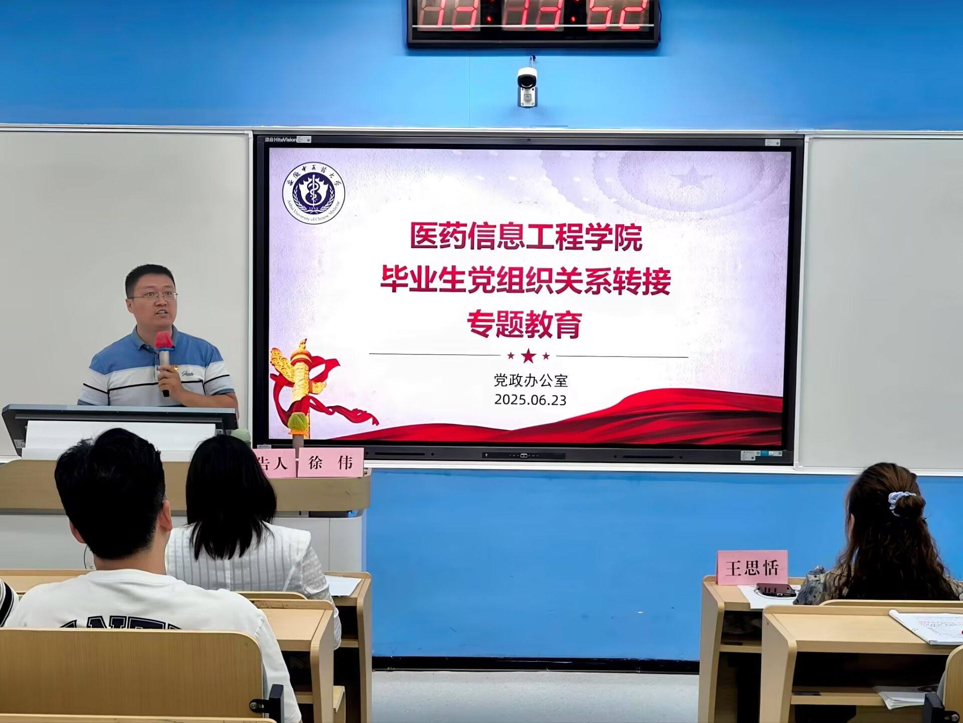 党政办公室主任、组织员徐伟聚焦2025届毕业生党员组织关系转接,以及党员教育管理工作要求做专题教育。