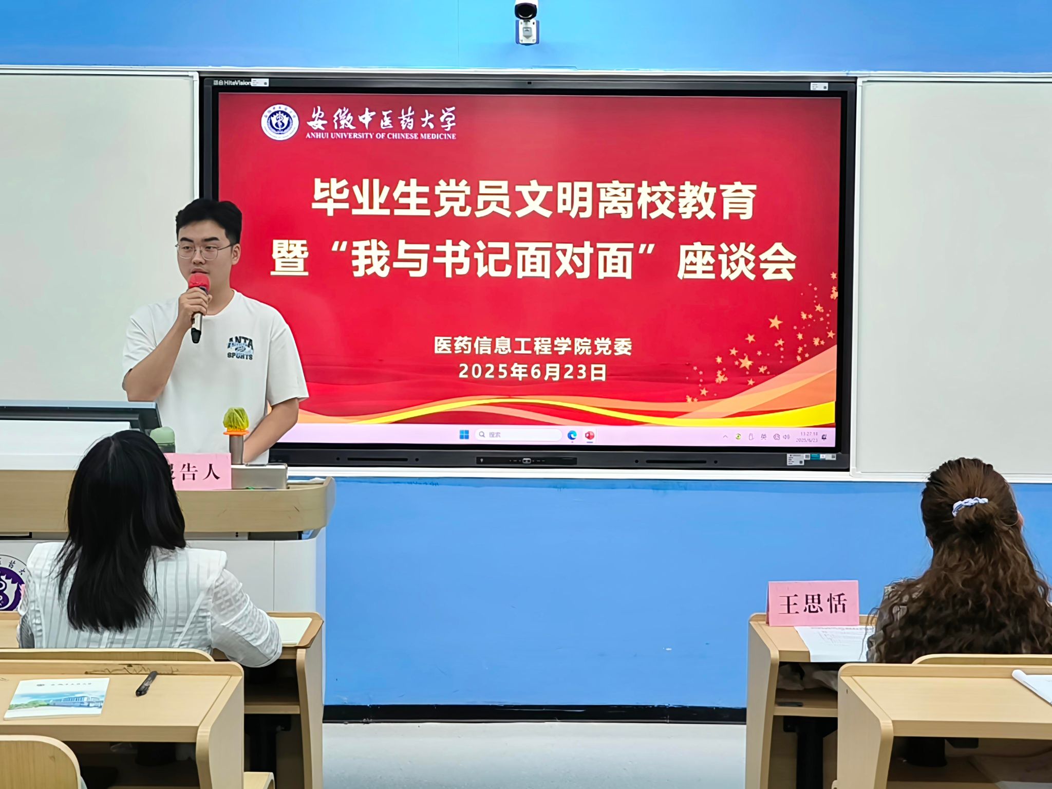 毕业生党员作交流发言,2021级生物医学工程班王家鸣在发言中说:“将以医药信息人的专业素养、责任意识和创新精神,为祖国的医药IT建设、为健康中国的伟大事业贡献我们的智慧和力量。”