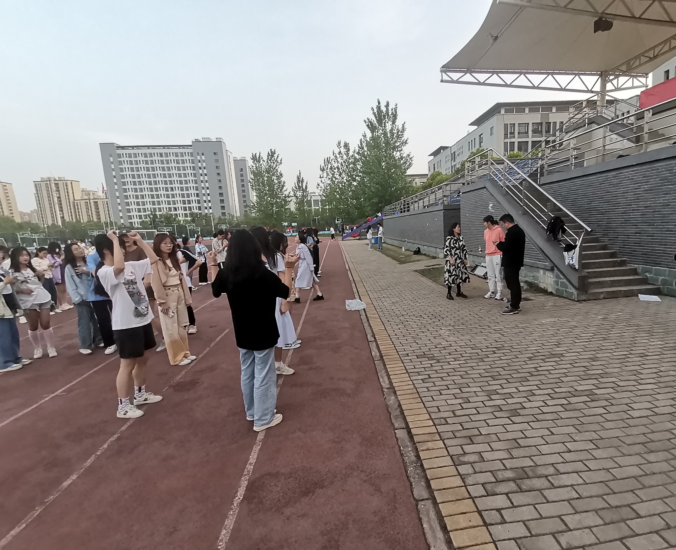第一站:走上操场观看团体操训练。徐伟与训练的同学进行了交流,提出了改进建议。