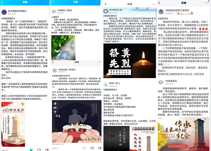同时,各团支部通过QQ、微博等多种媒体,发表了缅怀先烈的相关内容,传承和弘扬革命精神,致敬英雄烈士,大力营造关注英烈、缅怀英烈、学习英烈、守护英烈的浓厚氛围。