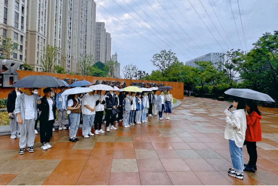 延乔路纪念碑前,员工兼职副书记张禹萱向同学们介绍了延乔路背后的故事——陈延年、陈乔年两位革命者的英勇事迹,天下起了蒙蒙细雨,同学们都非常认真地聆听,用心感悟。