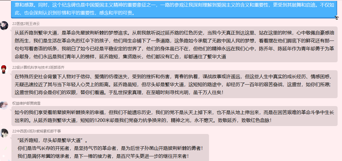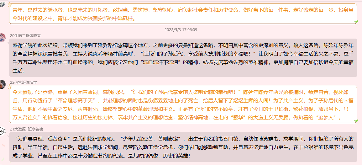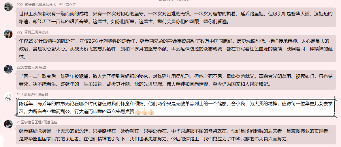 活动结束后,同学们对此次活动都发表了自己的心得体会,张晓雯表示之前只是知道这条路,不明白其中富含的深刻意义,踏入这条路,陈延年陈乔年的革命精神深深震撼着我,主持人说陈乔年牺牲前高呼:“让我们的子孙后代,享受前人披荆斩棘的幸福吧!”让我明白了如今幸福生活的来之不易,我们应该学习他们“流血流汗不流泪”的精神,弘扬发展革命先烈的英雄精神。焦娇表示我们要学习延乔兄弟选择一条路并坚定走下去的信心和决心,为建设社会主义现代化强国贡献青年力量。