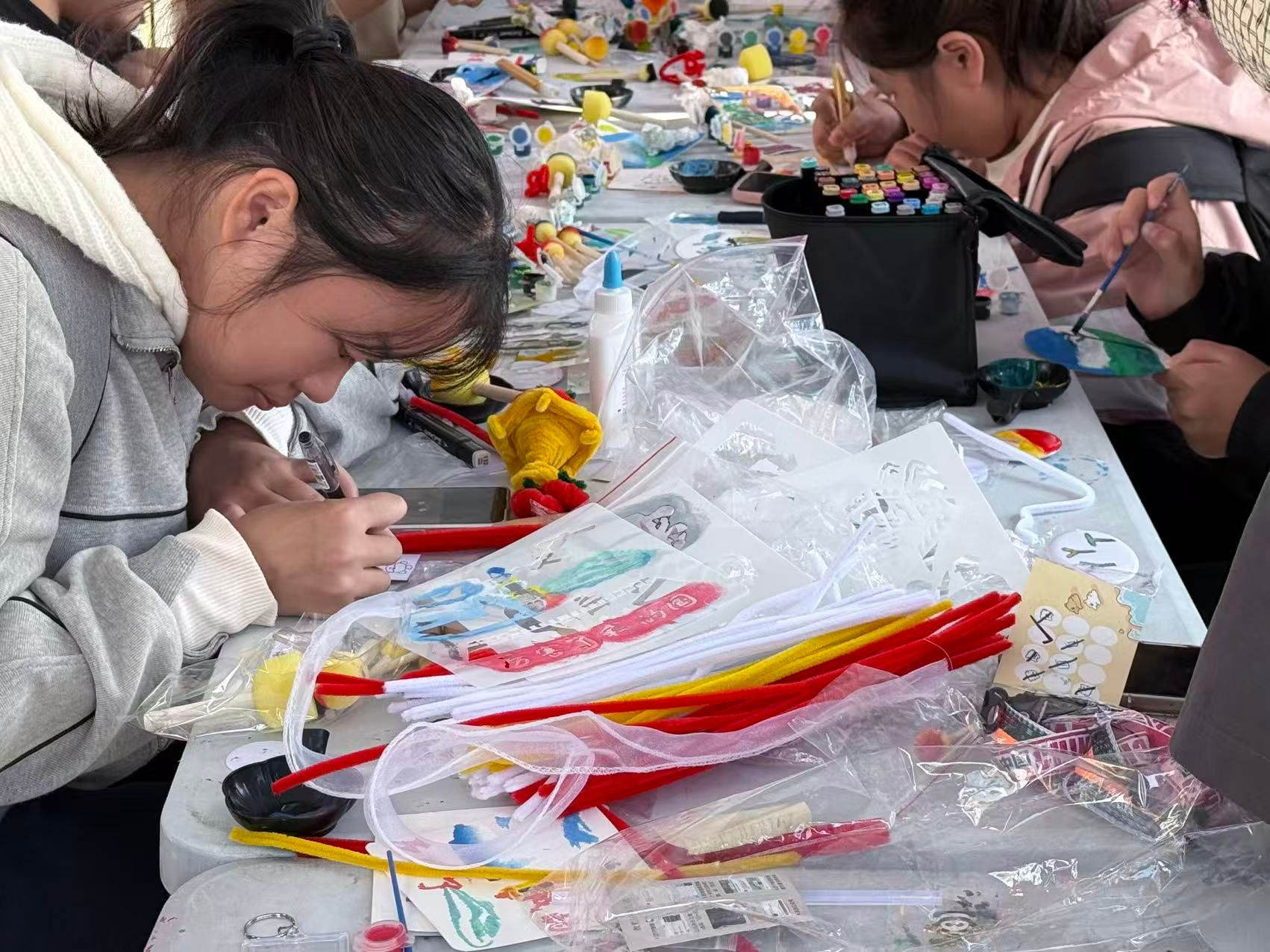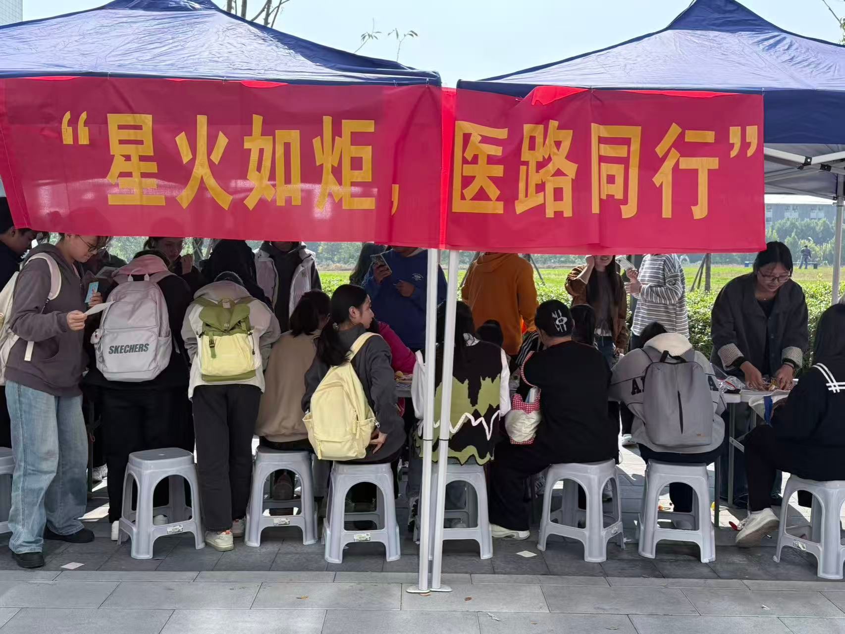活动现场气氛热烈,吸引了众多同学驻足参与。本次活动共设置了三个核心环节,分别为“‘医’心向党”主题DIY、“星光誓言”形象打卡以及“星光画卷·共绘寄语”融合创作。