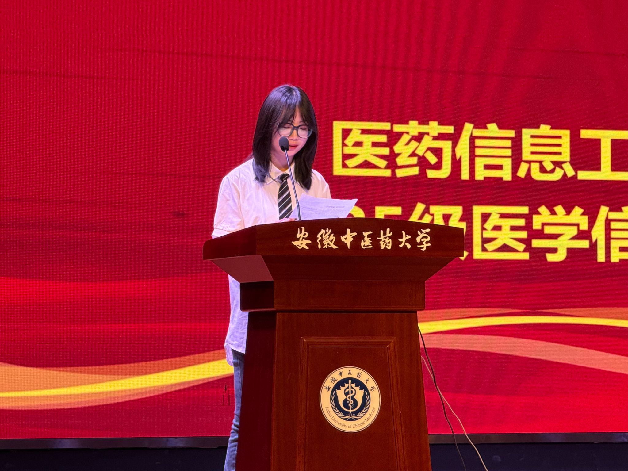 2025级医药信息工程班李梦涵代表新生发言,她表达了对未来的美好憧憬,表示要通过自我“突破”努力,勇于担当时代责任,在大学的新征程上以梦想为指引,奋勇前行,成就更好的自己。