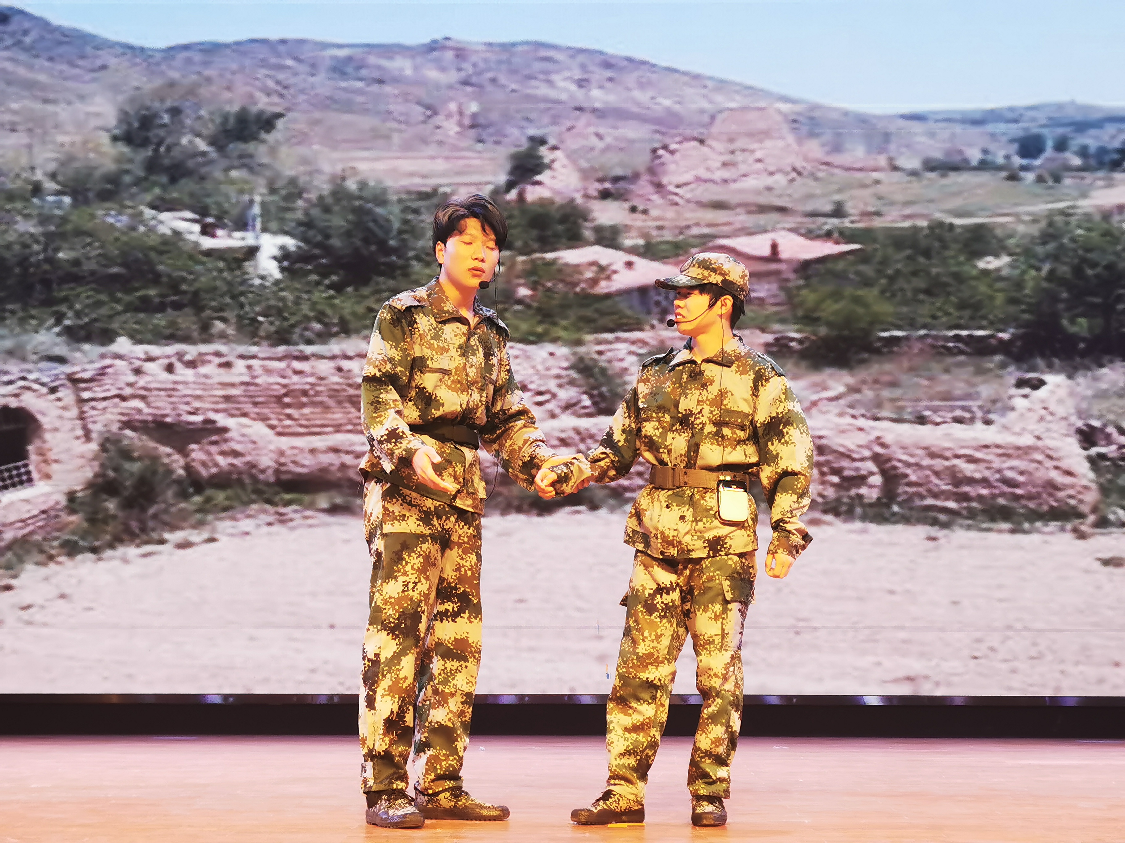 第三篇章“勇担时代使命,谱写时代篇章”。独幕剧《交接》歌颂了当代青年踊跃参军、克服困难和寂寞,守卫边防、建设边疆,以自己的实际行动,谱写了爱国的伟大篇章。歌曲《强国一定有我在》,呼唤广大青年永远追随中国共产党,坚定信念、放飞理想,培养能力、磨炼意志,争做可堪大任的人才。
