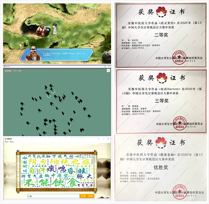 2016级生物医学工程专业盖灵菲同学的参赛作品《药灵契约》(指导老师:汪庆、马春)斩获数媒游戏与交互设计组全国二等奖;2018级计算机科学与技术专业钱奕辰同学的参赛作品《收获Harvest》(指导老师:许欢庆、束建华)荣获数媒游戏与交互设计组全国三等奖;彭旭东、李煜和车增阳同学的参赛作品《健康卷轴》(指导老师:许欢庆、包新月)获得全国优胜奖。