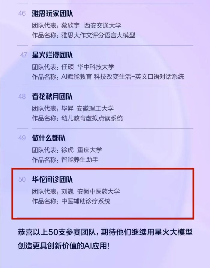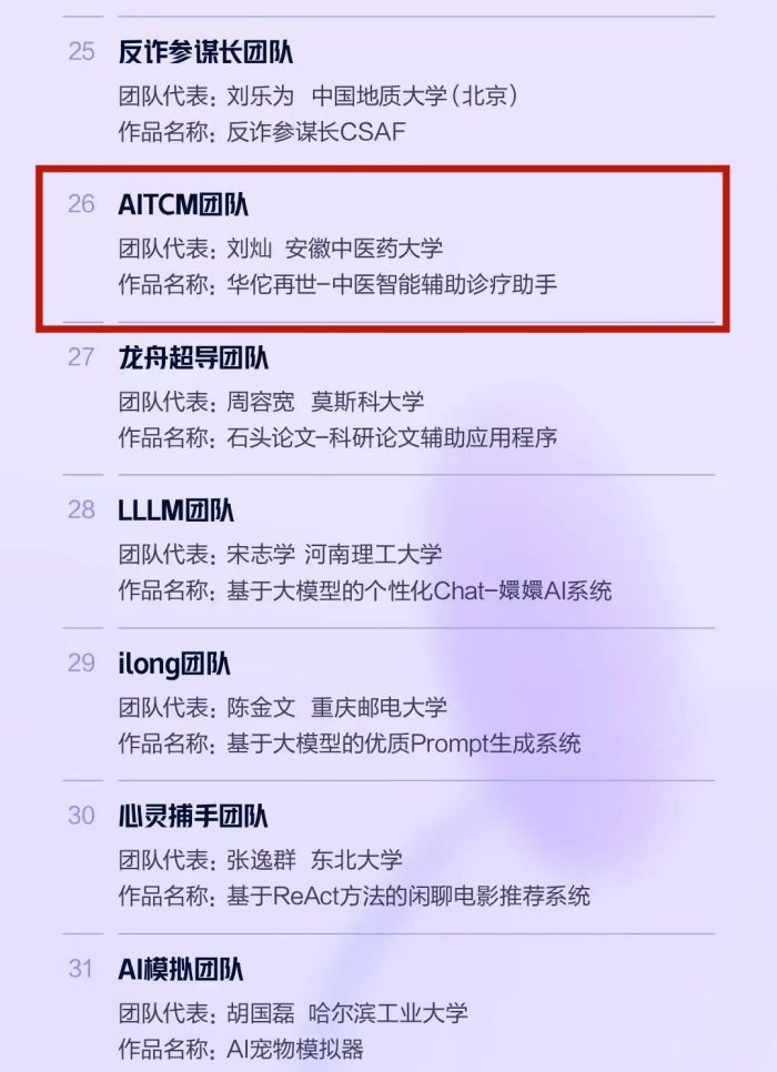 为鼓励高校挖掘有潜力、有创意的通用人工智能人才,拓展认知大模型技术的行业应用场景,为我省打造科技创新策源地、新兴产业集聚地贡献青春力量。团省委、省教育厅、省科技厅、省学联共同主办,科大讯飞发起并承办高校人工智能创新赛事。校团委按照比赛要求,今年6月启动赛事相关工作,在校内积极宣传动员,最终《华佗在世-中医智能辅助应用程序》(项目负责人:刘灿、2021级中医药信息学研究生,指导教师:胡继礼)和《中医辅助诊疗系统》(项目负责人:刘巍、2022级中医药信息学研究生,指导教师:阚红星、王鹏、方向明)两件作品入围全国 TOP50,并进入下一阶段专家评审。