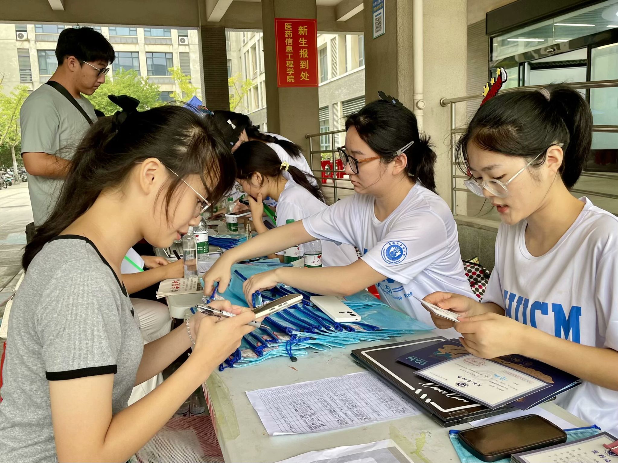 在九月的晨曦中,在英国正版365官方网站门前,志愿者们身着志愿之风、怀着满心的热忱,迎接每一位新生及家长。他们分工明确,耐心细致地为新生做好入学检录报到、物品发放、拍照录像、文化展示,行李搬运等服务。