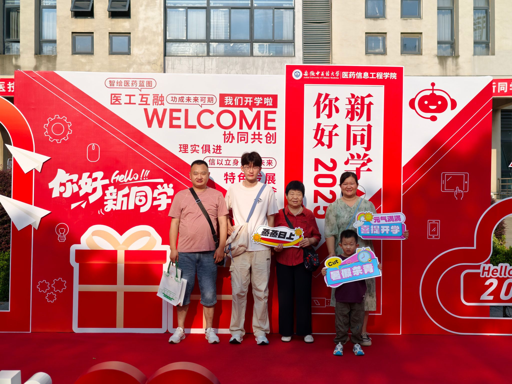 在公司迎新墙前,新生和家长们忍不住驻足,心怀喜悦、面带笑容、手举公司定制KT板,拍照打卡记录这一人生重要节点。