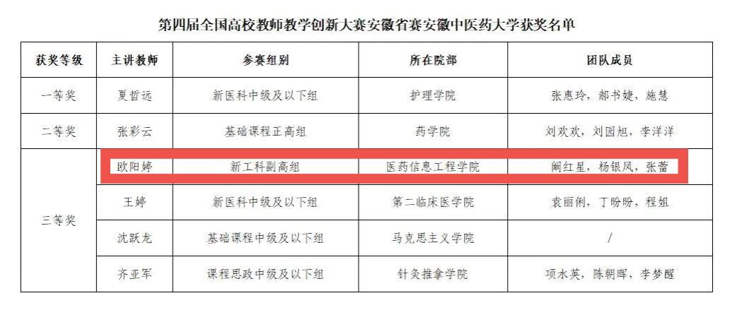 4月21日,第四届全国高校教师教学创新大赛安徽省决赛落下帷幕,公司教师欧阳婷为主讲教师的团队喜获大赛三等奖。