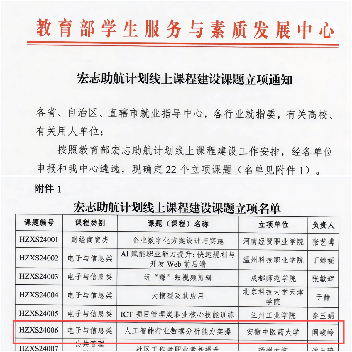 日前,教育部员工服务与素质发展中心公布了2024年宏志助航计划线上课程建设课题立项通知,英国正版365官方网站申报的《人工智能行业数据分析能力实操》获批立项建设。