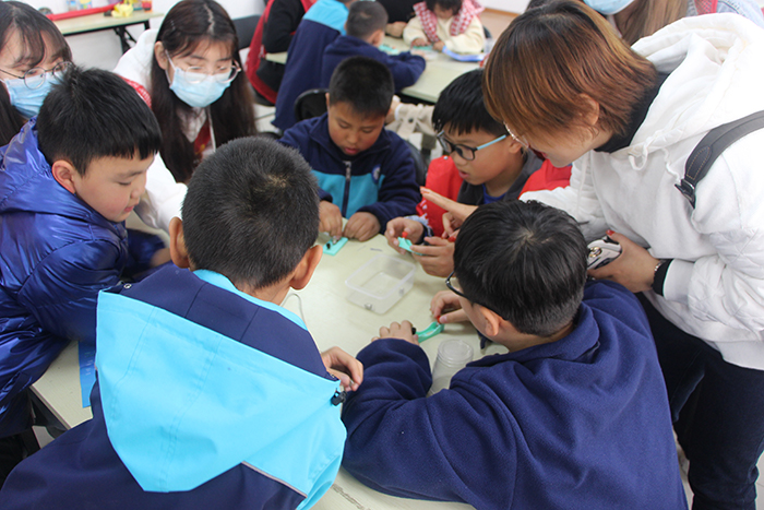 在物理实验——点亮小灯泡中,在志愿者的引导下,孩子们最终完成了实验,并且简单了解了其中的原理。化学实验——神奇的液体中,由于化学物品具有一定的危险性,志愿者们展演了整个过程,随着液体颜色的变化,孩子们发出阵阵惊叹,志愿者们解释了其中的奥秘。