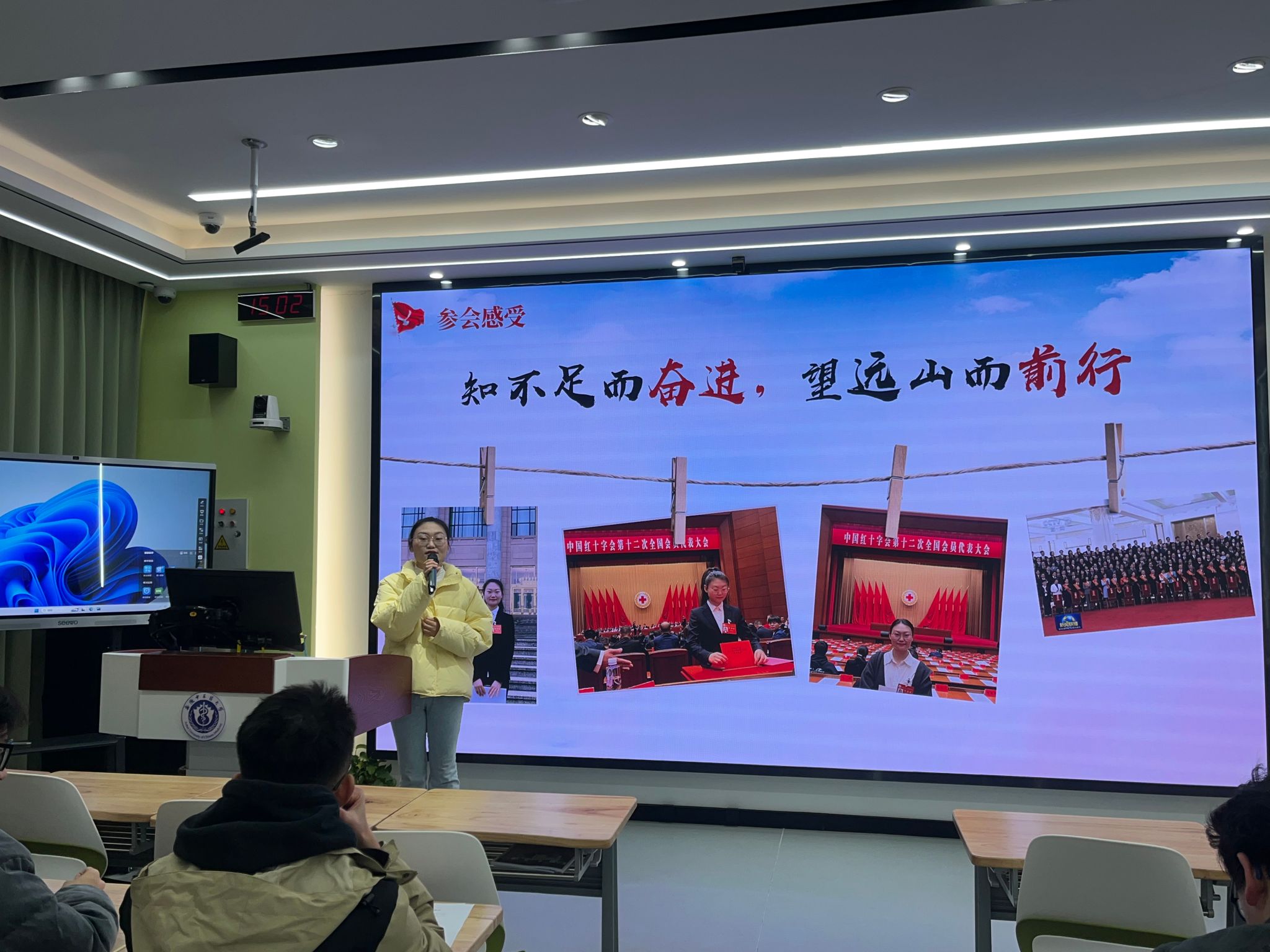 胡雅兰分享的主题是“志愿服务永远在路上”,她分享了作为安徽省唯一一名在校研究生代表参加中国红十字会第十二次全国会员代表大会的心得体会,讲述了她在校期间志愿服务的经历,包括社区义诊活动、大型赛事志愿服务、暑期“三下乡”活动等,还分享了她在志愿服务活动中的个人成长与收获,最后她激励参会的同学们积极投身青年志愿服务工作,以实际行动践行“人道、博爱、奉献”的红十字精神。