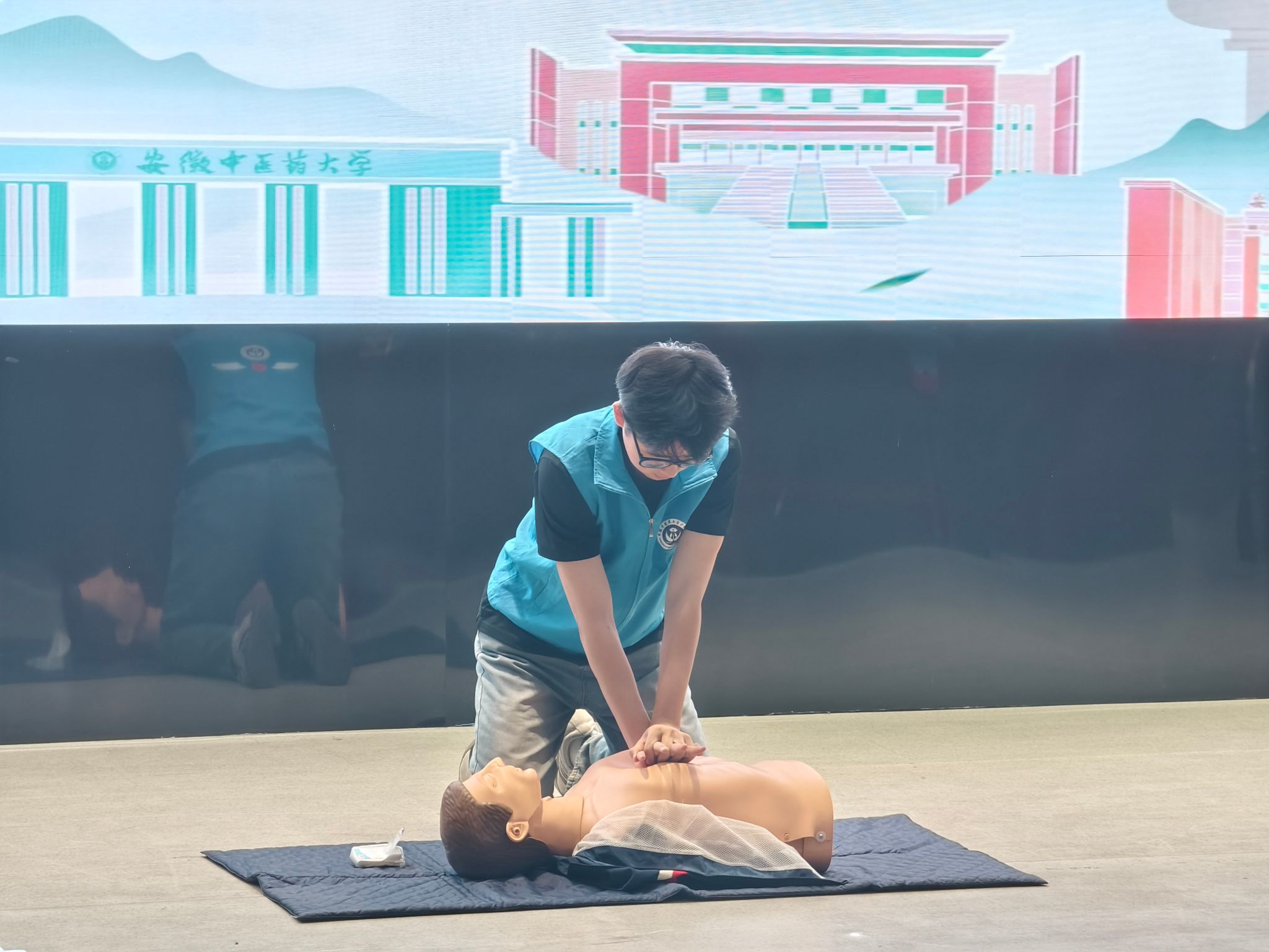 护理公司的工作人员通过 PPT 宣讲心肺复苏的重  要性及具体操作方法,涵盖判断救助者状态、胸外按压、开放呼吸道等关键环节,并在宣讲后组织志愿者和现场同学进行演示,帮助同学们掌握救命技能。