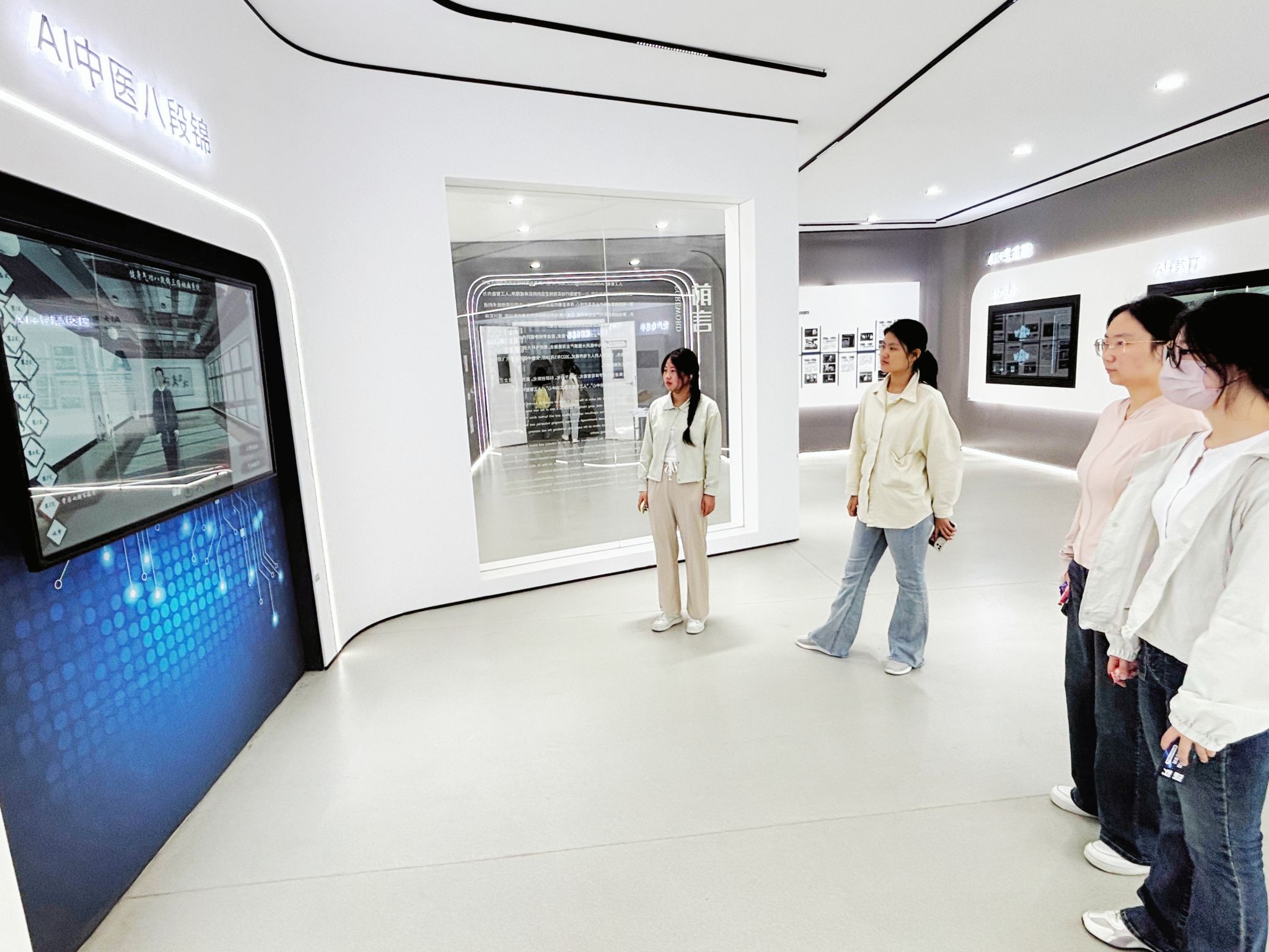 同学们踏入极具科技感的 AI 中医展厅。展厅内通过动态屏幕展示着中医诊断数据的智能分析过程,展示了 AI 如何通过大数据分析,精准捕捉中医的诊断要素,将千年中医理论转化为可视化、数据化的现代诊疗模型。同学们紧跟讲解节奏,不时凑近设备观察操作细节,在互动体验中直观感受 AI 中医的诊断流程与技术优势。