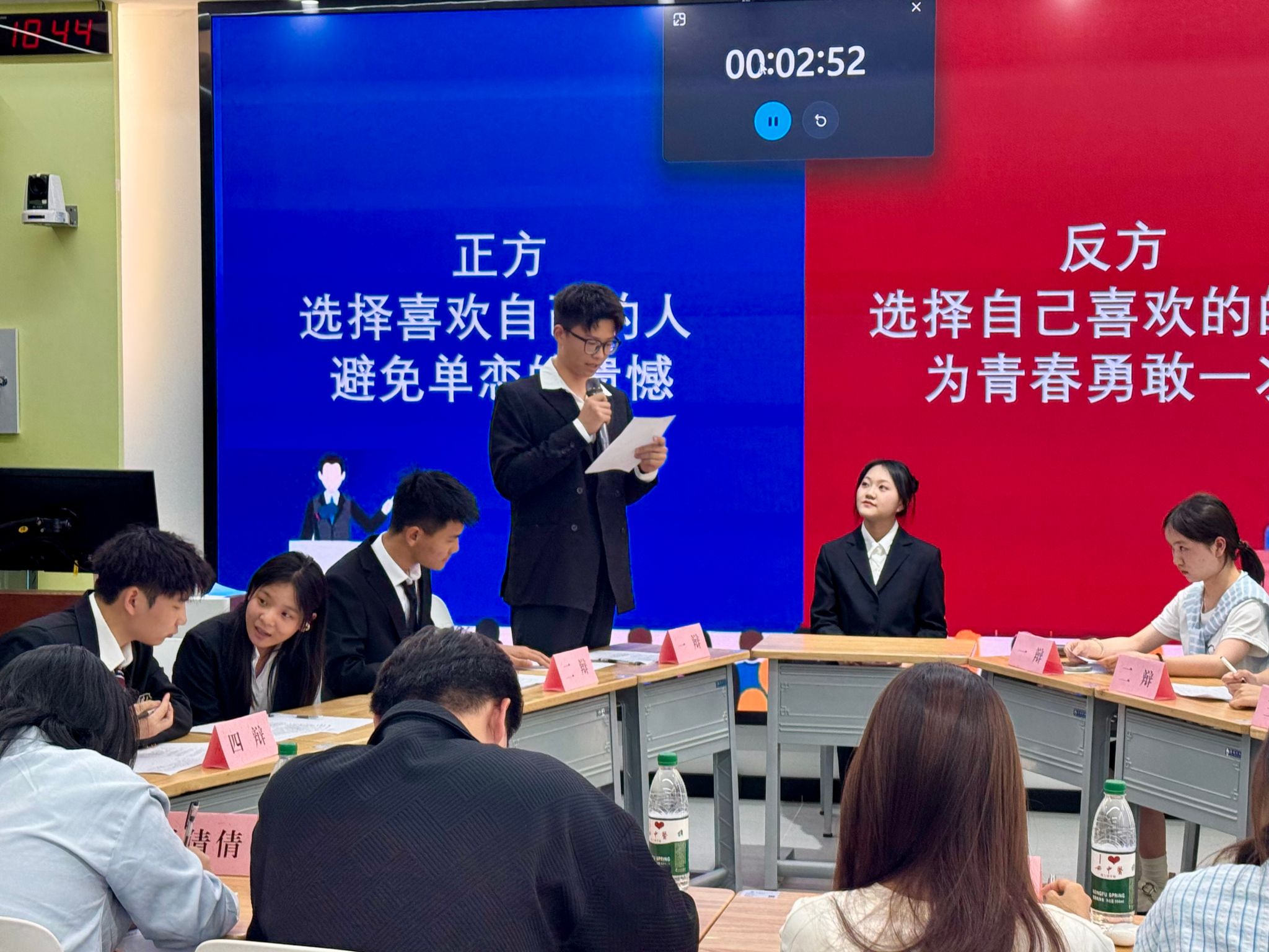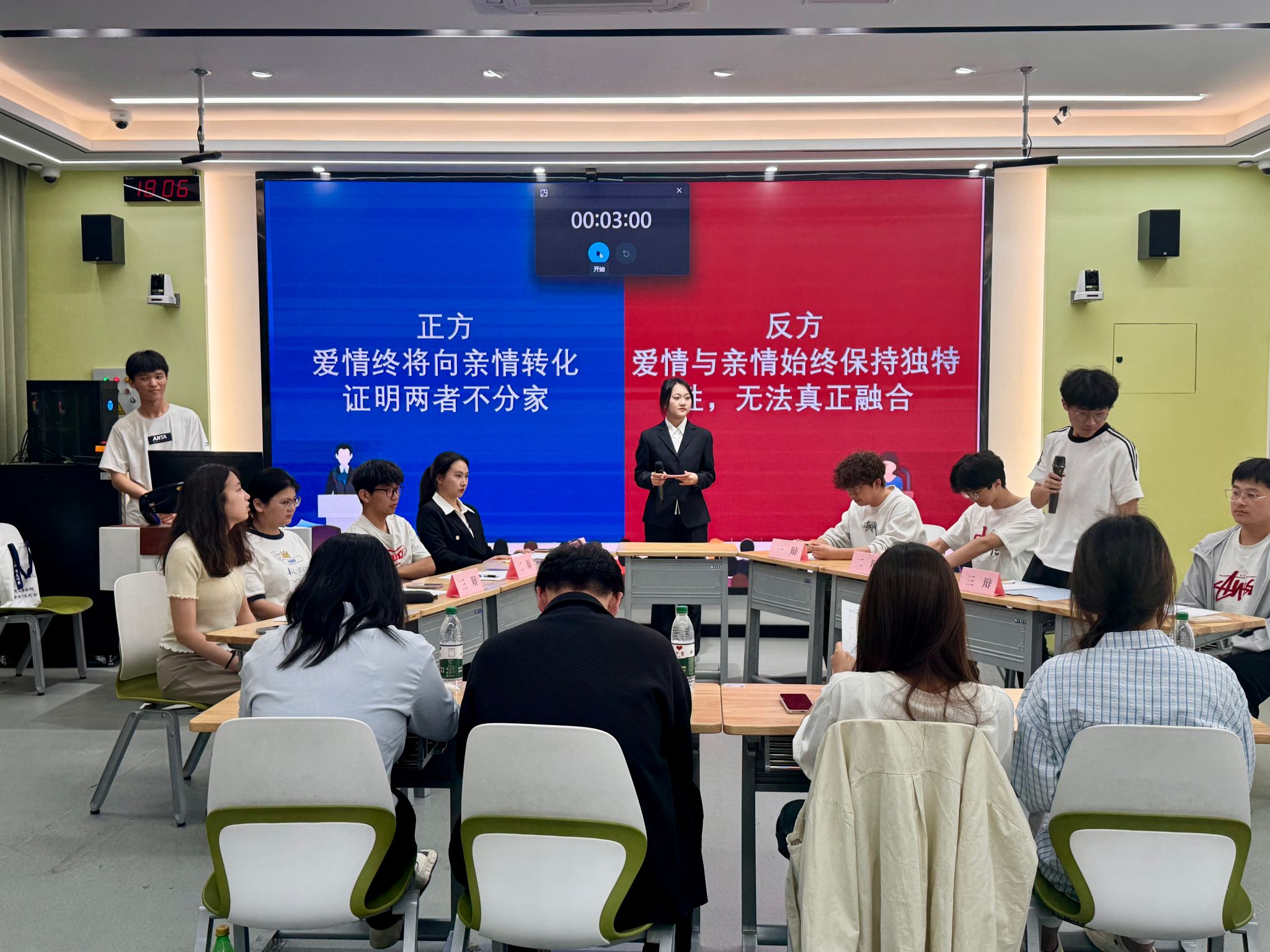 活动现场,各支队伍聚焦“爱情与亲情的关系”“选择喜欢自己的人还是自己喜欢的人”“穿越时空该回到过去还是前往未来”等辩题展开深度交锋。在情感议题辩论中,选手们结合心理学理论与生活实例,探讨爱情与亲情的边界与转化,一方以“婚姻中爱情向亲情的自然演变”论证情感交融性,另一方则以“爱情的排他性与亲情的无条件性”强调两者独特性。在爱情选择的思辨中,辩论双方分别从“安全感需求”与“青春体验价值”出发,就避免单恋遗憾”与“勇敢追逐热爱”的利弊展开攻防,既有理性的数据支撑,也有感性的价值升华;在穿越类辩题的对抗中,选手们脑洞大开,结合科幻叙事与科技前沿,围绕“改变历史的意义”与“探索未知的吸引力” 展开逻辑博弈,从“蝴蝶效应”的理论探讨延伸到“数字永生”的未来想象。
