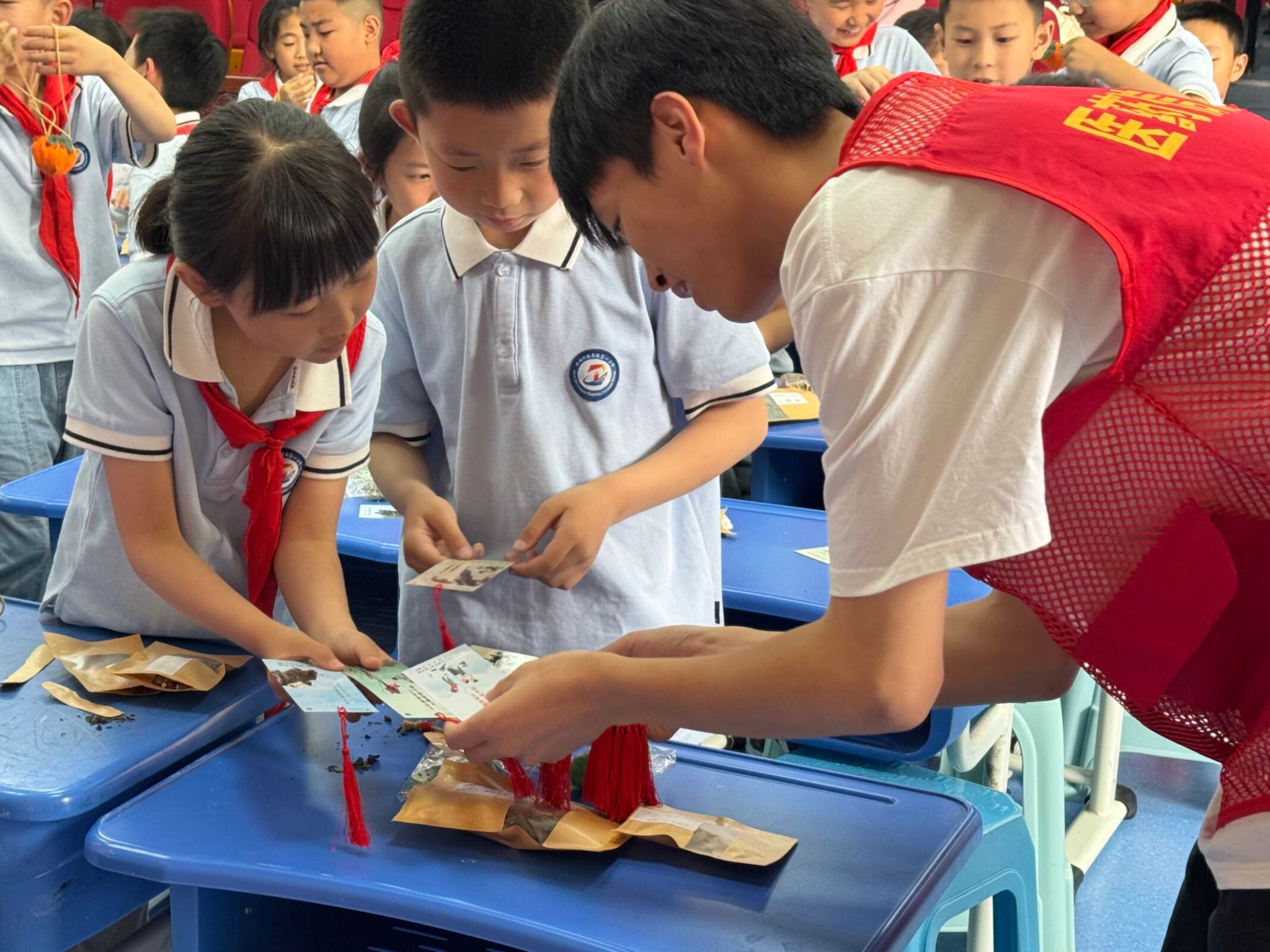 随后,同学们在志愿者们的指导下动手制作了中医药香囊。在穿针引线、填充药材的过程中,同学们深刻感受了传统工艺的魅力。