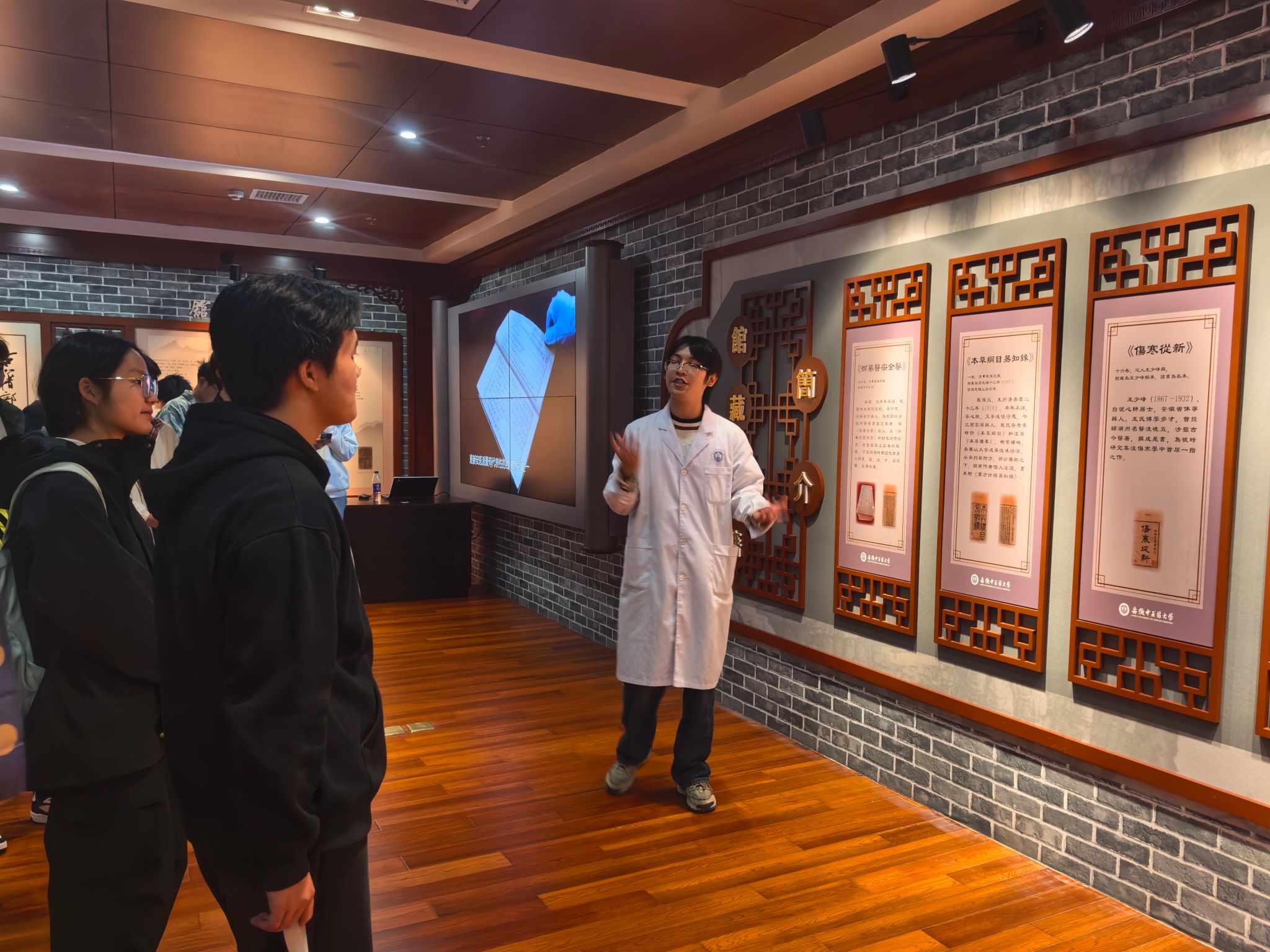 步入古籍特藏馆,陈列柜中的珍贵典籍凝聚着古人智慧,令同学们肃然起敬。馆外设计独特的古籍墙以众多医学经典之名环绕一个“书”字,凸显书籍作为中医药文化传承的重要载体。古籍馆既承载着中医药学的厚重历史,也展现出与时俱进、创新转化的时代活力。