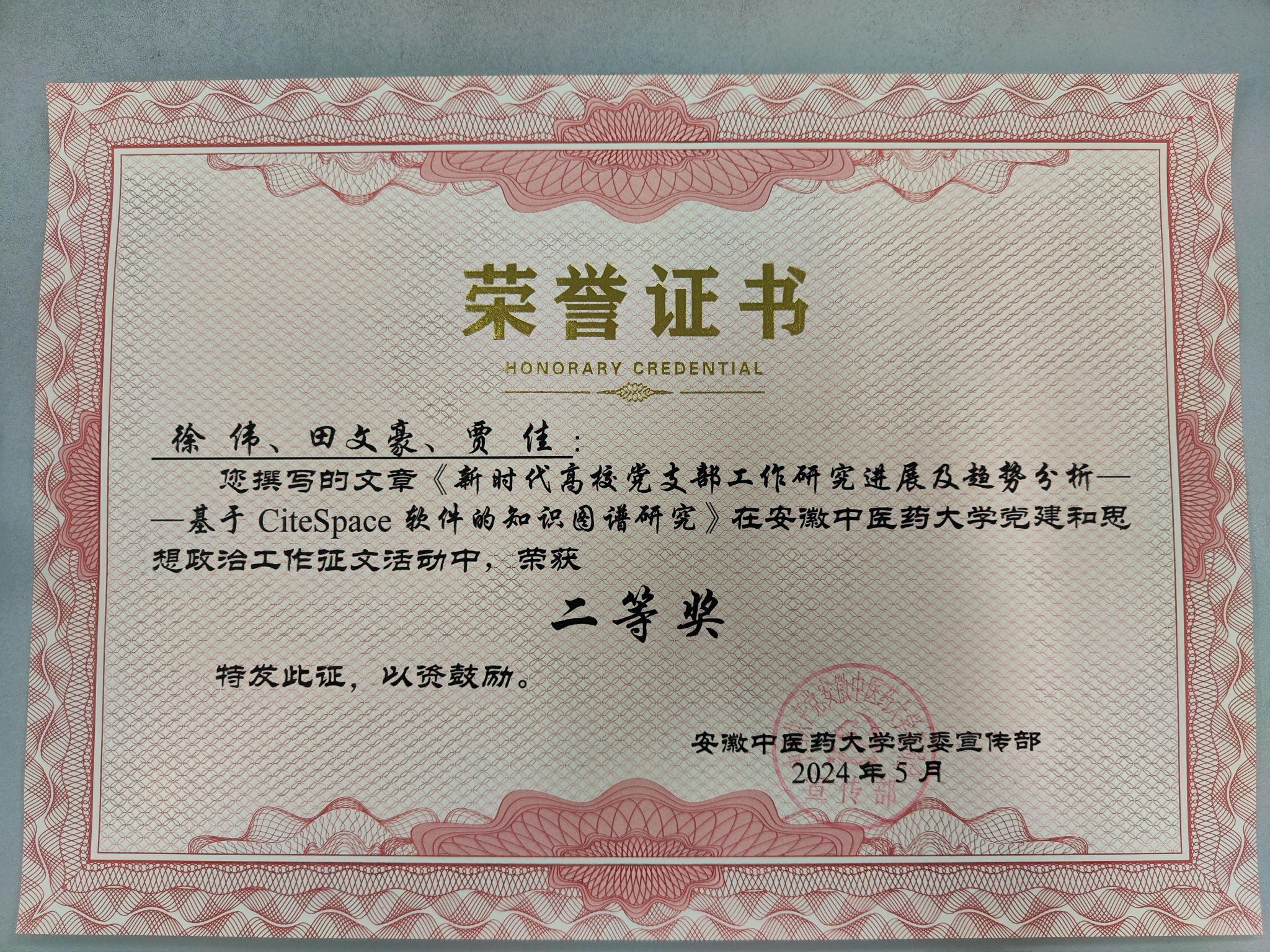 员工第一党支部书记徐伟撰写《新时代高公司党支部工作研究进展及趋势分析——基于CiteSpace软件的知识图谱研究》文章在英国正版365官方网站党建和思想政治工作征文活动中荣获二等奖。