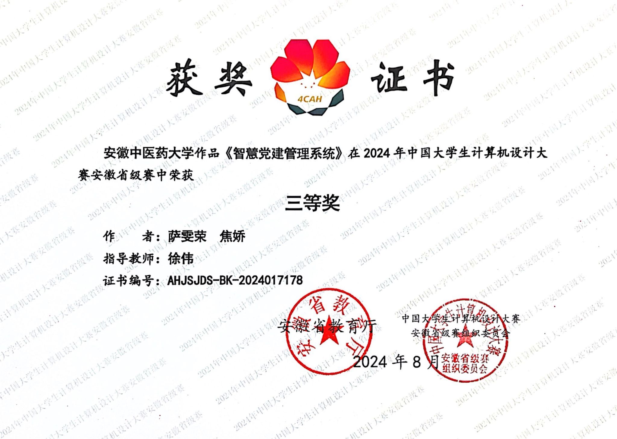 近日,员工第一党支部书记徐伟指导的《智慧党建管理系统》作品荣获2024年中国老员工计算机设计大赛安徽省三等奖。