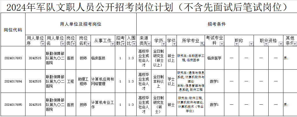 2024年军队文职人员公开招考岗位计划(计算机类专业可报)