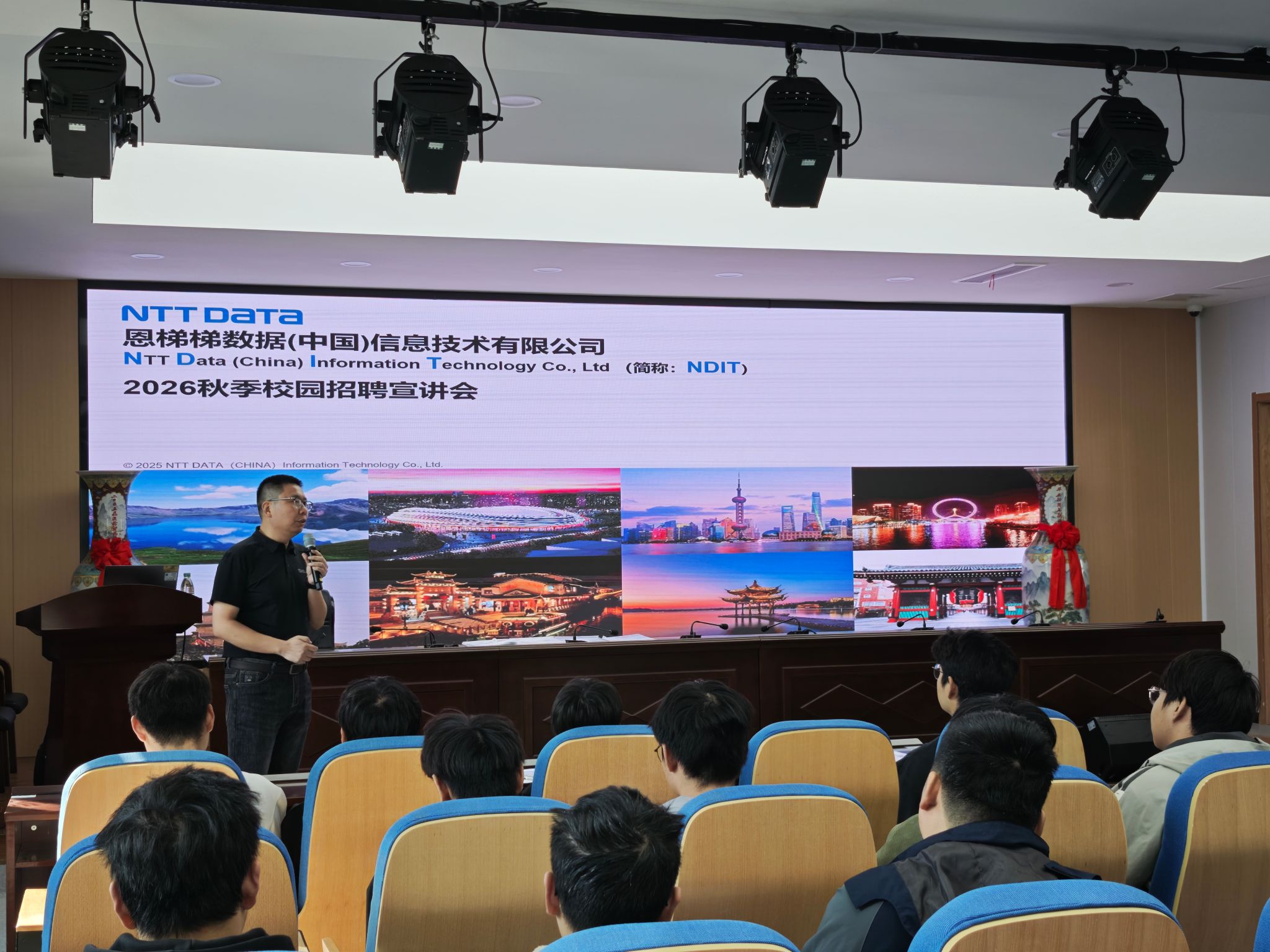 招聘会伊始,岳剑峰向在场同学全面介绍了恩梯梯的发展历程、核心业务领域、行业地位及未来战略规划。岳剑峰详细罗列了此次校招岗位的具体职责、专业要求及能力素养需求,针对同学们尤为关注的福利待遇,他从薪资体系、假期、职业培训计划、晋升发展通道等方面进行了全面说明,让同学们对未来的职业发展与保障有了清晰认知。