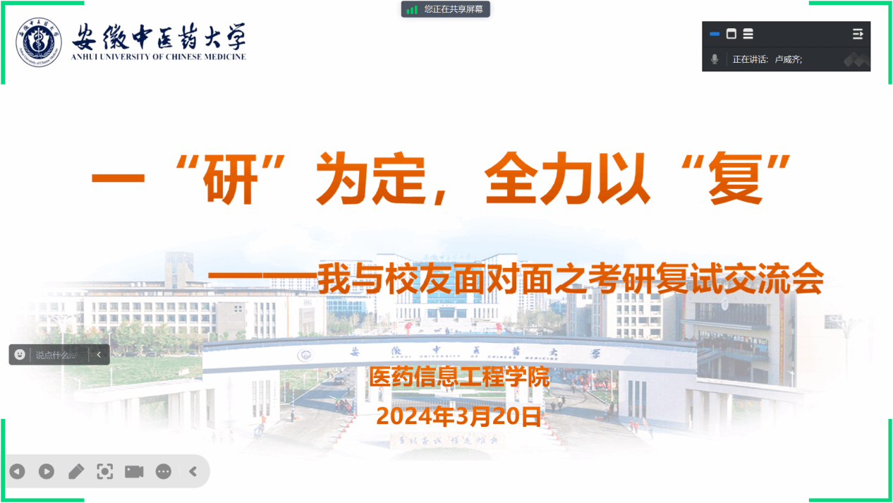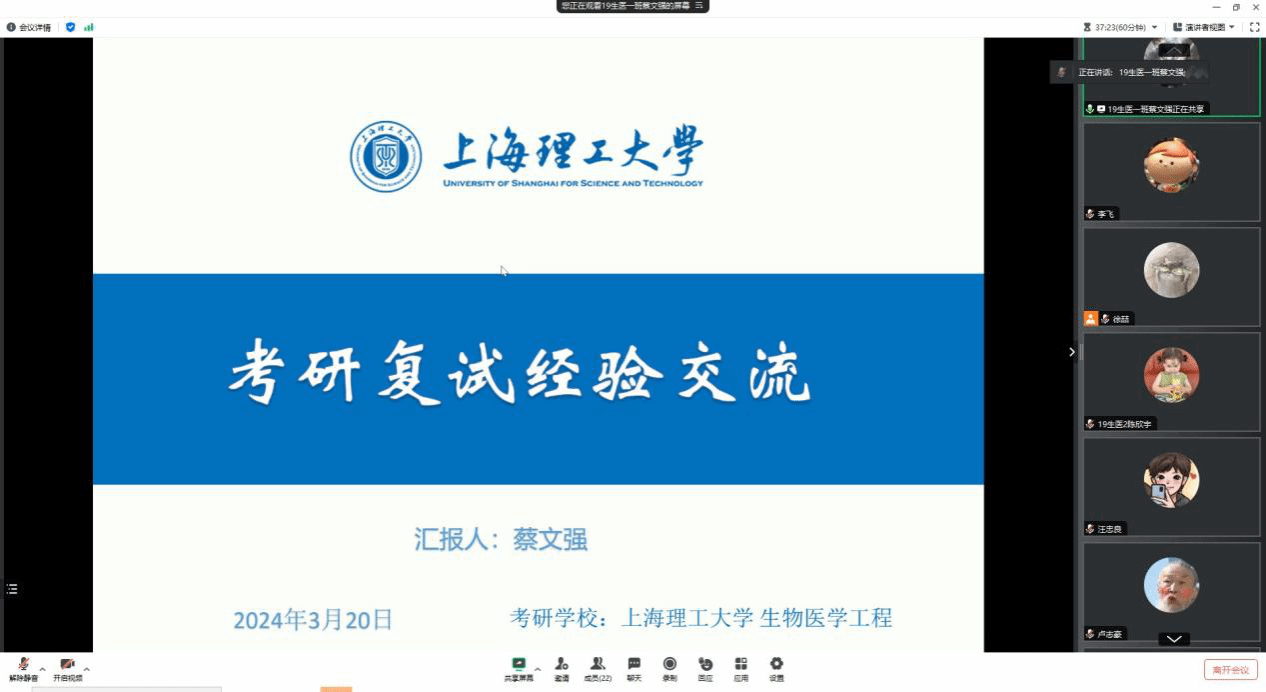 2019级生物医学工程专业员工李飞详细介绍了考研复试的流程分析和雷电分析等方面,强调要在复试过程中态度诚恳,举止大方,充分展示自身的优点与特长;2019级生物医学工程专业员工蔡文强鼓励同学们要保持干劲,力争一战成硕,同时提醒同学们重视复试环节,充分做好复试与调剂准备,拼搏坚持到最后一刻。其余员工分别结合自身考研复试经验,在信息收集、备考技巧、自身强化、心态调整等多个方面给予了学弟学妹们建议。