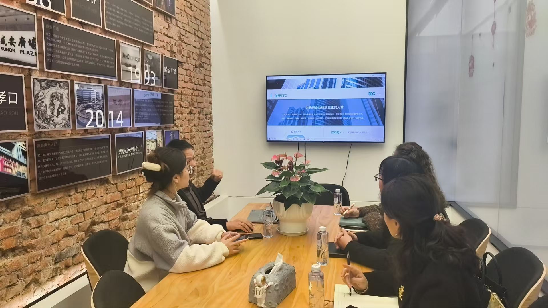 首站到访合肥TTC,企业合肥办公室负责人陶奎热情接待公司一行,并带领参观企业共享办公区域。作为一家AI原生国际性人力资源公司,合肥TTC深耕“AI+人力资源”交叉领域,2023年接连获得源码资本、创新工场以及2024年九合创投等顶级投资机构的3轮融资,通过技术创新、服务创新、模式创新等方式,打造有规模、有效率、有品质的创新平台。公司在听取企业介绍后,向企业了解了2025届毕业生招聘需求,又与企业就如何拓展更多形式的校企合作问题上展开了座谈。
