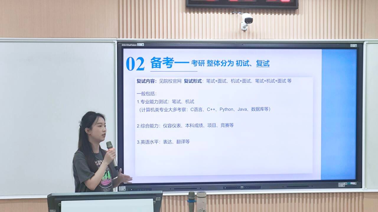 2021级数据科学与大数据技术专业的王静分享了考研备考历程,从院校和专业选择、复习计划制定,到心态调整和时间管理,她毫无保留地将自己的心得一一讲述。她强调,考研是一场持久战,需要坚定的信念和科学的方法,建议低年级员工尽早确定目标,合理安排学习时间,多与老师和学长学姐沟通,借鉴他们的经验。