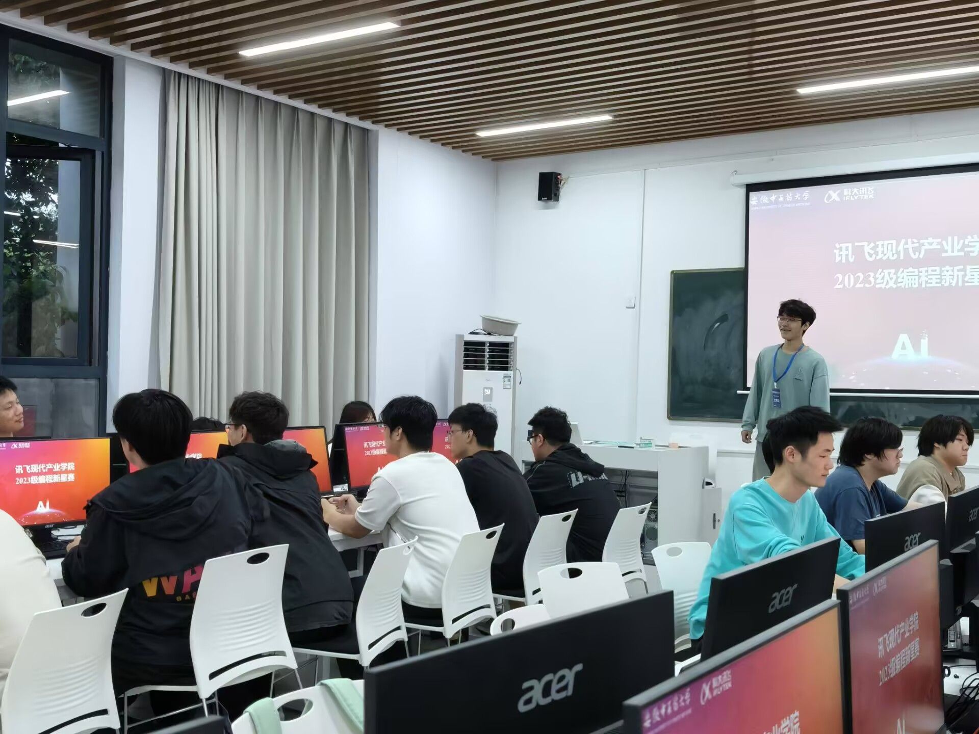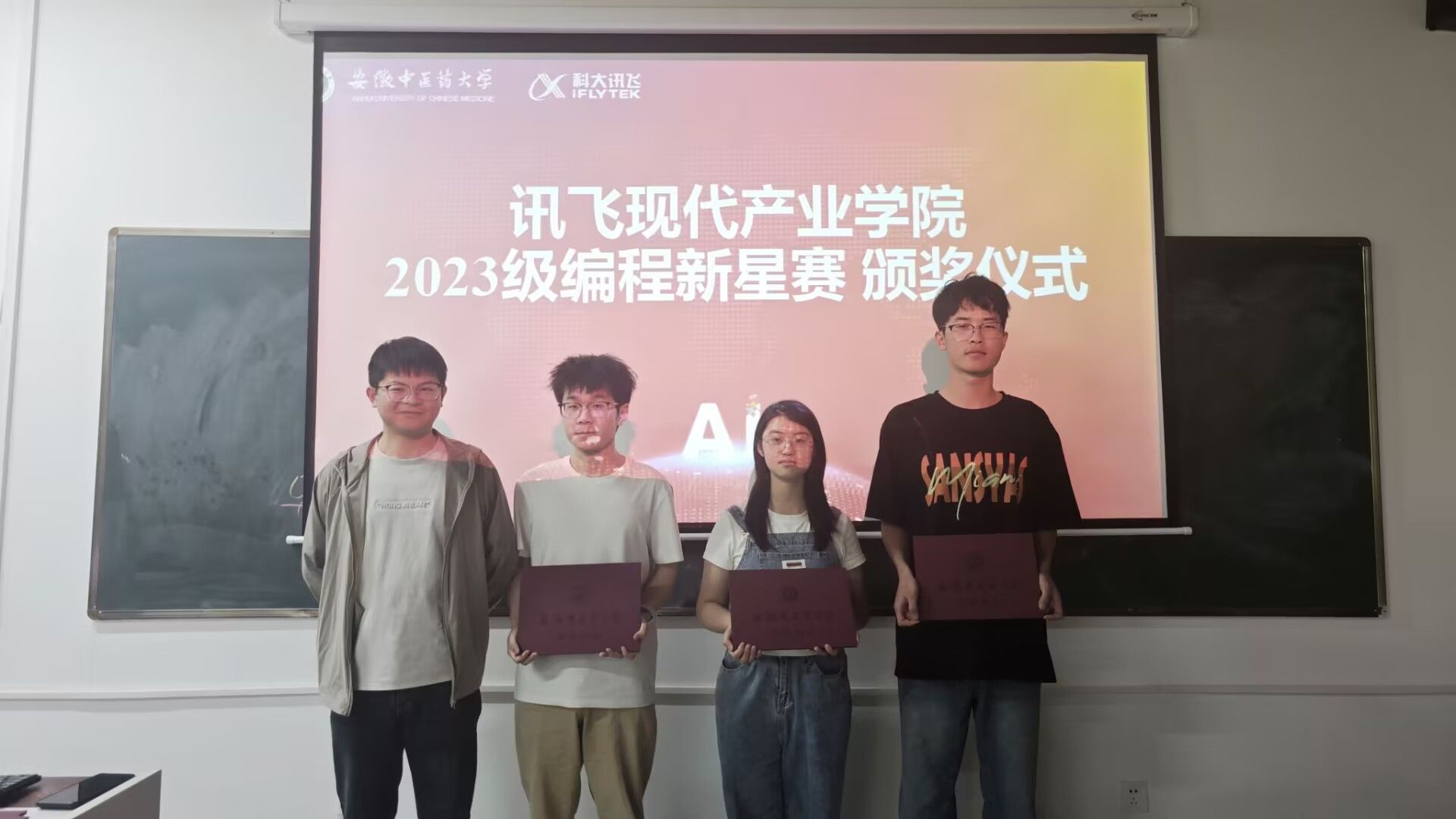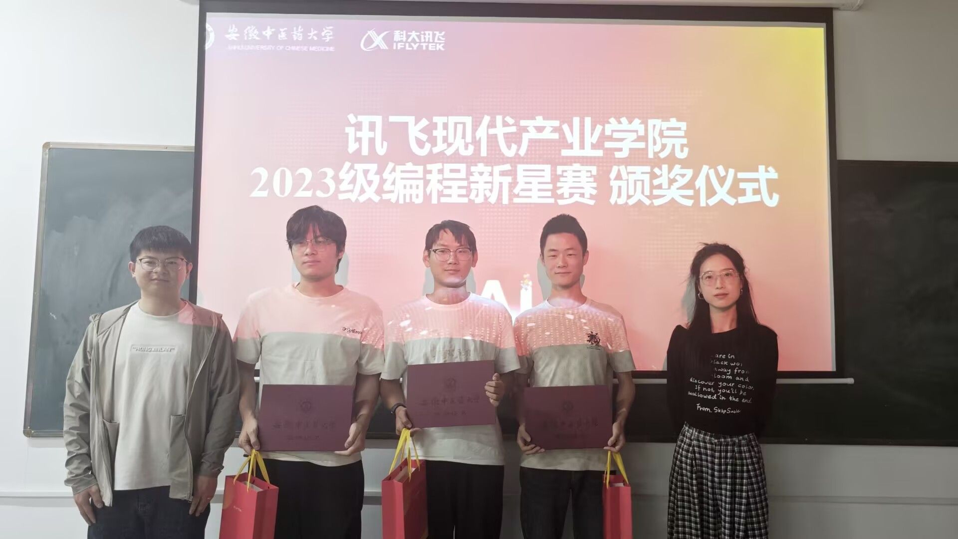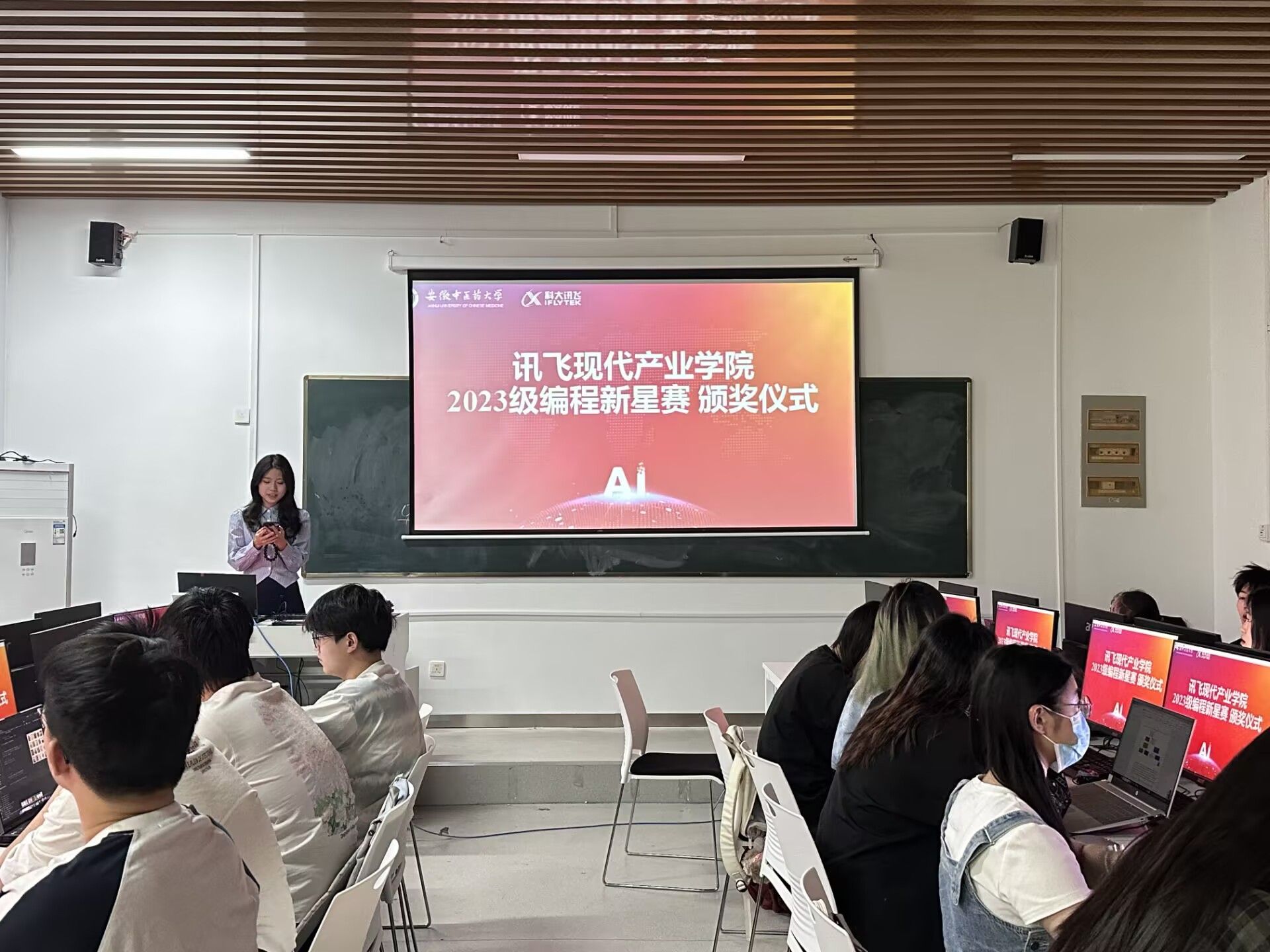 5月12日,讯飞现代产业公司2023级人工智能班首届"编程新星赛"颁奖典礼在人工智能实训室举行。赛事吸引班级全员参与,历经2小时算法实战,最终评选出一等奖3人、二等奖3人、三等奖3人以及优秀奖5人,由科大讯飞叶晨与班级辅导员黄勇共同颁奖。